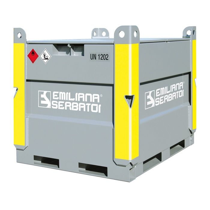 Rezervor cub de 950 litri, construit din oțel carbon, sudat etanș, vopsit cu pulberi după tratament de sablare, prevăzut cu separatoare de val, așezat într-un recipient metalic cu funcție de bazin de retentie la 110% cu dublă închidere și posibilitate de blocare cu lacăte.
